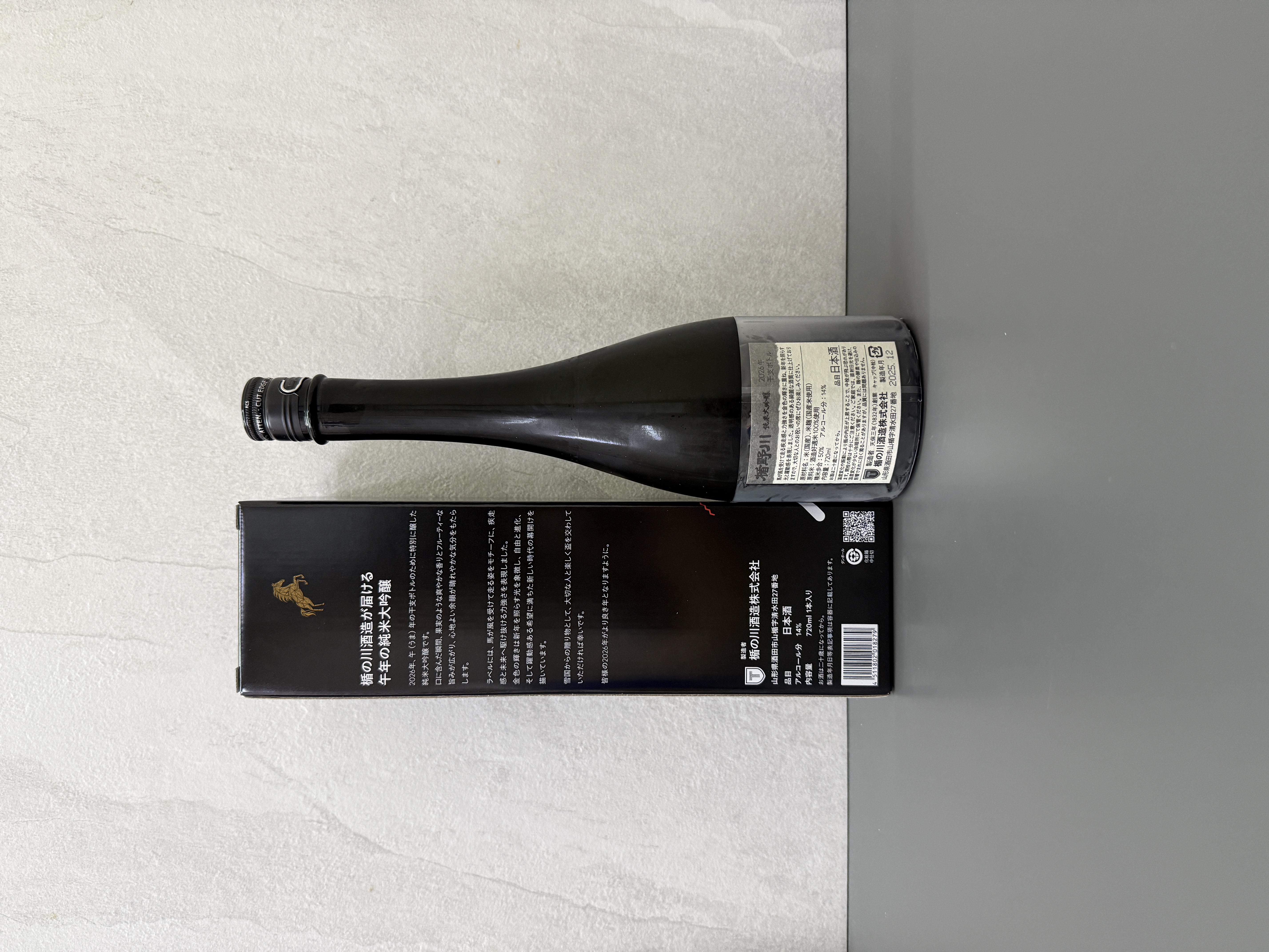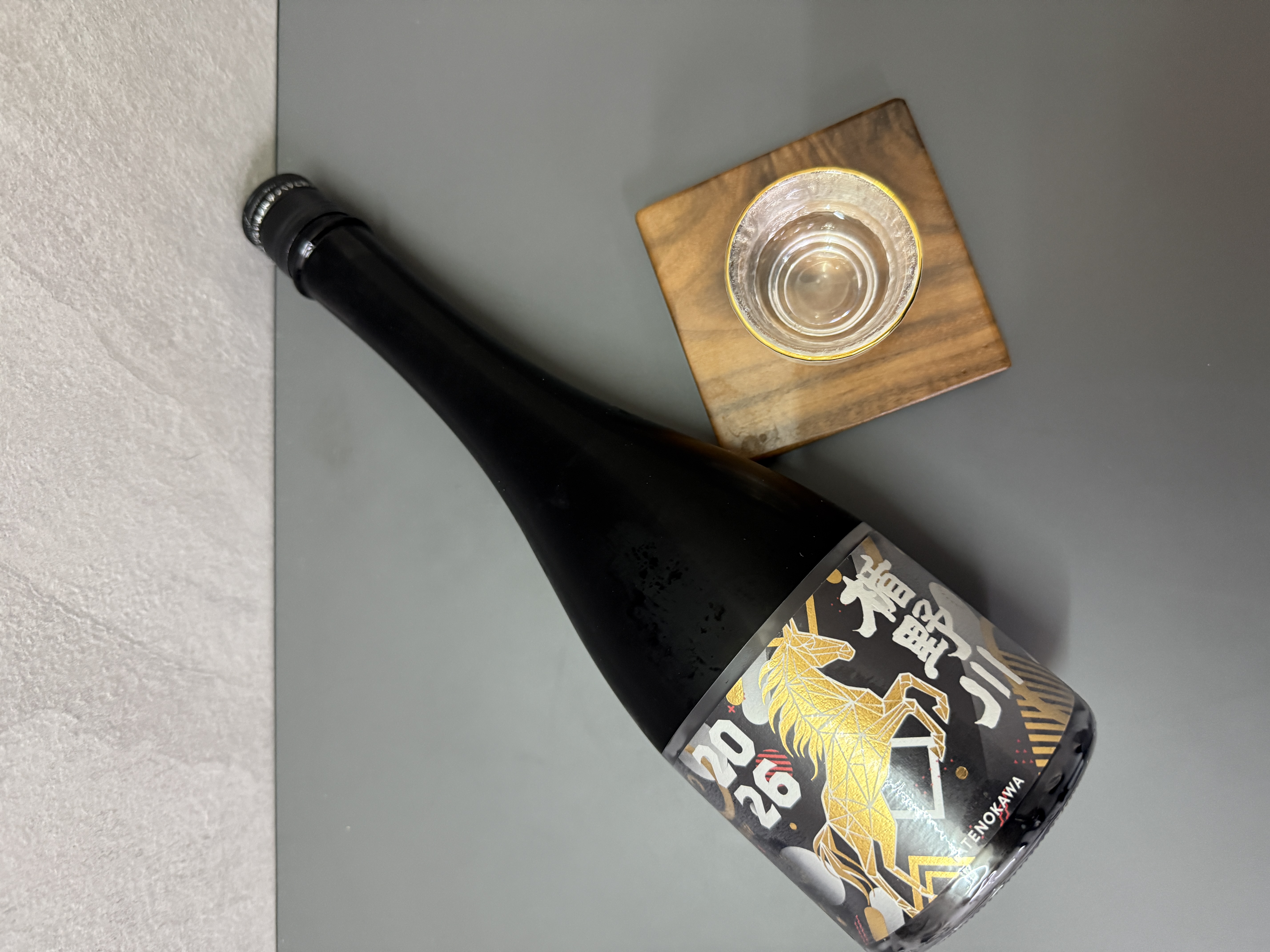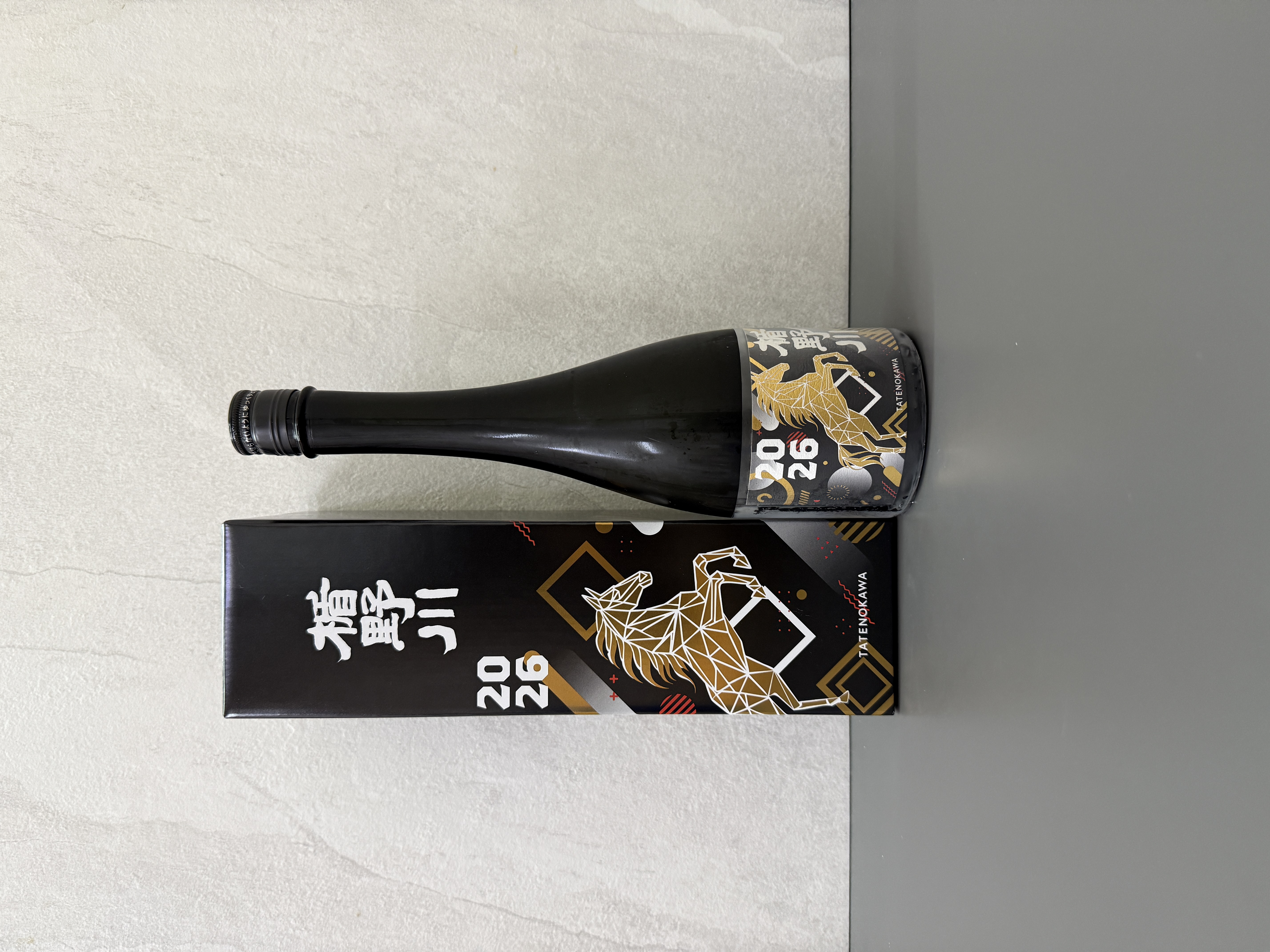 楯之川酒造2026年推出的這款生肖限定酒,以馬年為題,酒標設計巧妙地捕捉了馬匹迎風奔馳的姿態,動感十足,象徵著迎向未來的力量與自由。金光閃閃的奔馬穿梭於幾何圖案組成的世界中,展示著現代多元與和諧,寓意著活力與朝向嶄新時代的堅定步伐。